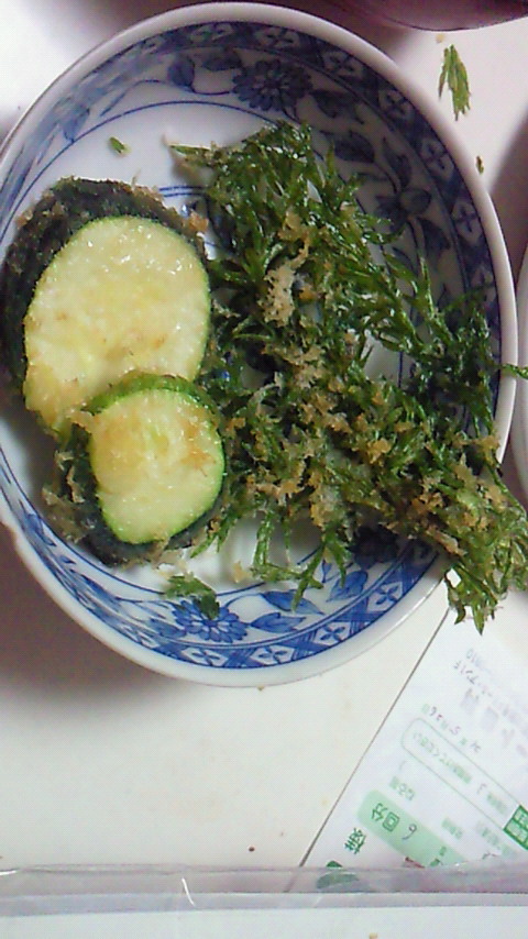 ③油の温度とか勘だけど、からっと揚がればそれでよし★ズッキーニは素揚げに近い感じになるよ。大して衣がつかないから。